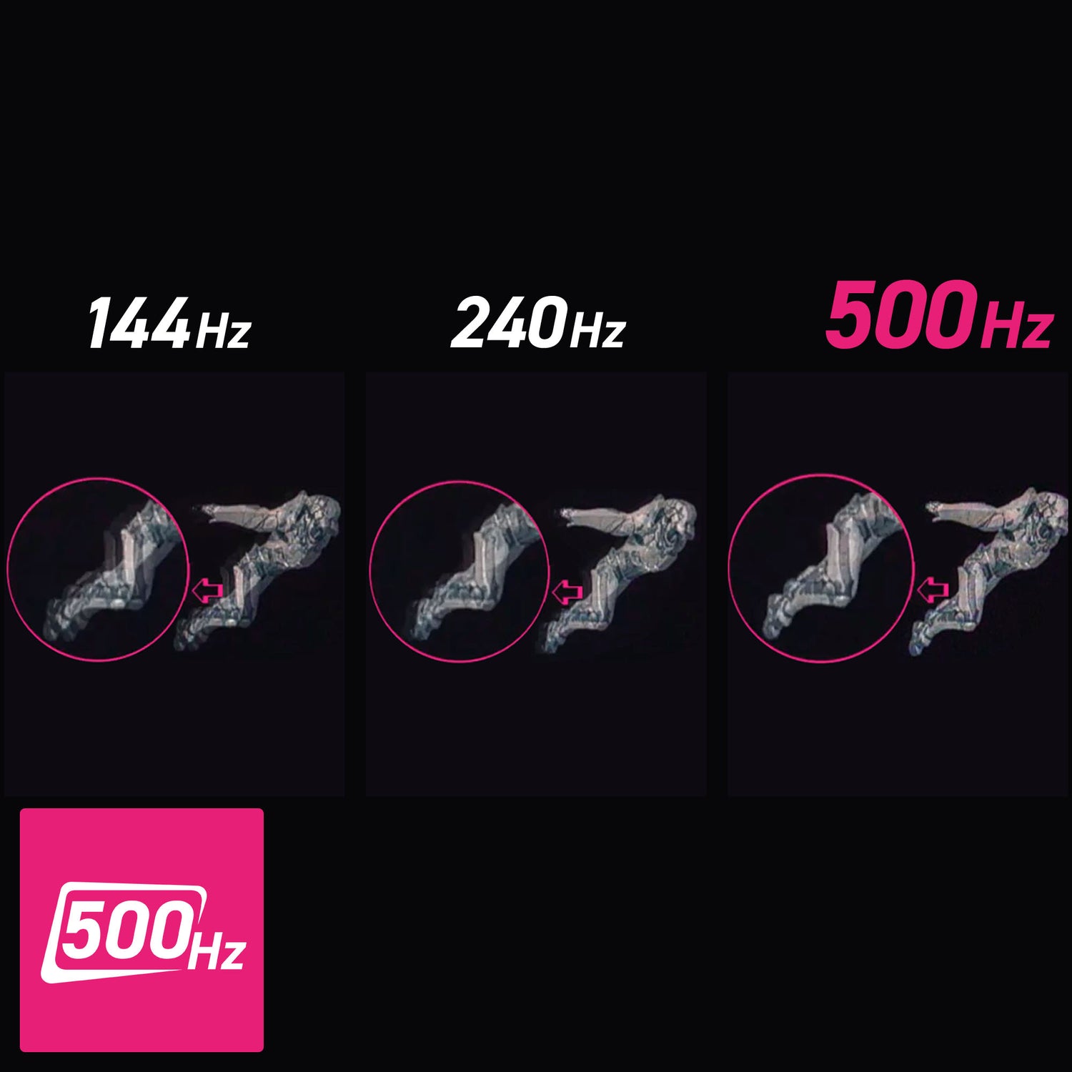 Super schnelle Reaktionszeit von 0,03 ms GtG und eine Bildwiederholungsrate von 500 Hz.